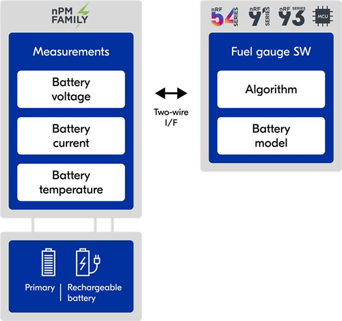 Nordic’s algorithm-based fuel gauging and battery health inputs real-time voltage, current, and temperature data from the PMIC into a mathematical battery model in the SoC software. The SoC uses this to accurately estimate the battery’s state of charge and state of health. The fuel gauge algorithm and battery model require only minimal flash memory and work just as well on 3rd part MCUs. There is no dedicated chip or licensing fees involved - just minimal flash memory usage and existing hardware costs.