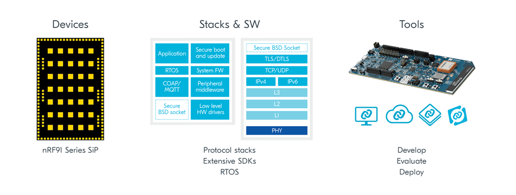 The nRF Connect SDK offers a comprehensive suite of features specifically designed for low power cellular devices. Developers can leverage the SDK's extensible framework to build size-optimized software for memory-constrained devices, as well as powerful and complex software for more advanced applications. By integrating the Zephyr RTOS, the SDK ensures a robust and reliable foundation for your projects while also supporting all the latest transport protocols as CoAP, LwM2M, MQTT, HTTP(S) etc.