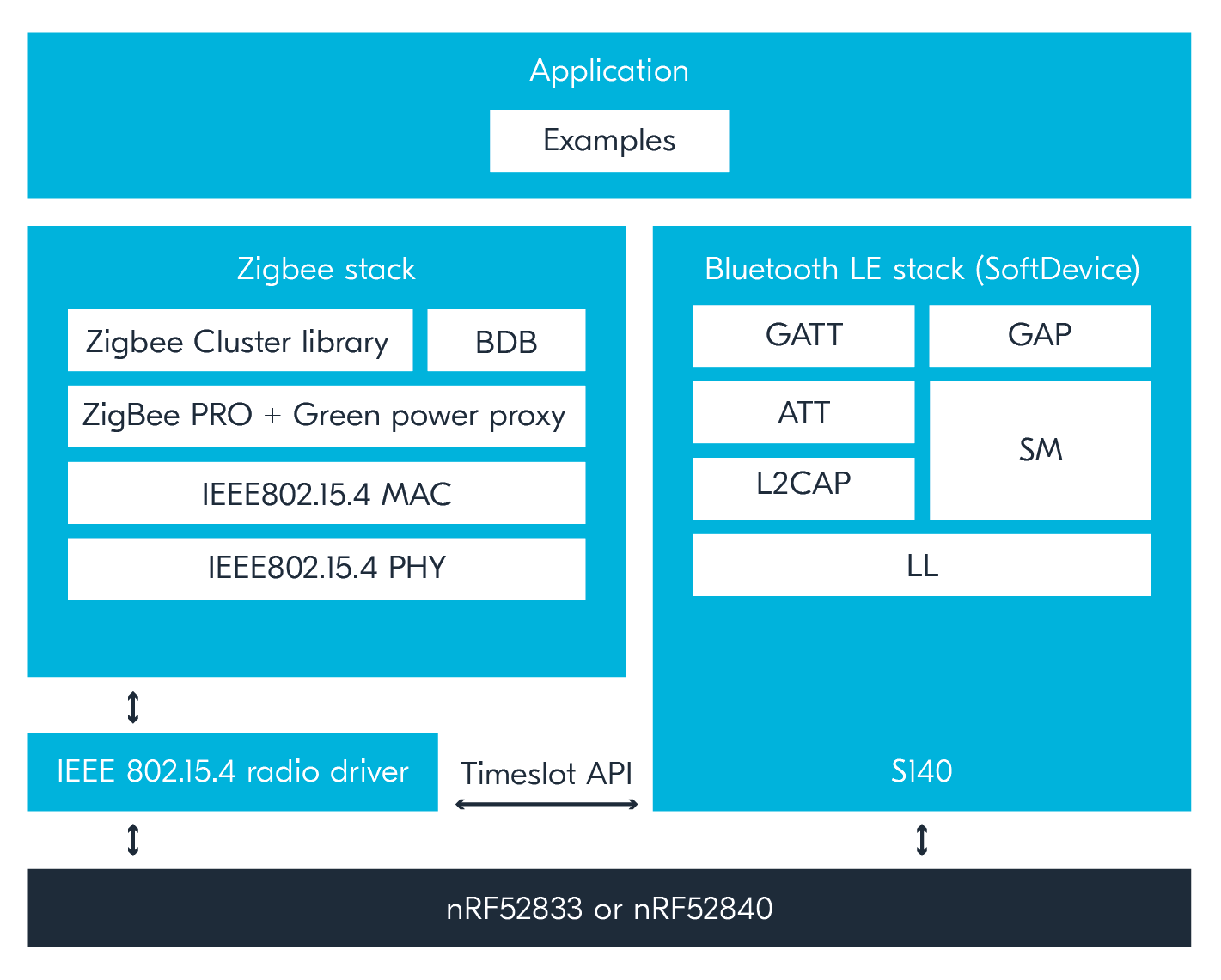 The multiprotocol capabilities are handled by the IEEE 802.15.4 radio driver. The radio driver is a generic, stack independent and system independent. It contains built-in support for multiprotocol, allowing for concurrent operation of IEEE 802.15.4-based protocols (e.g. Thread, Zigbee) and Bluetooth LE.