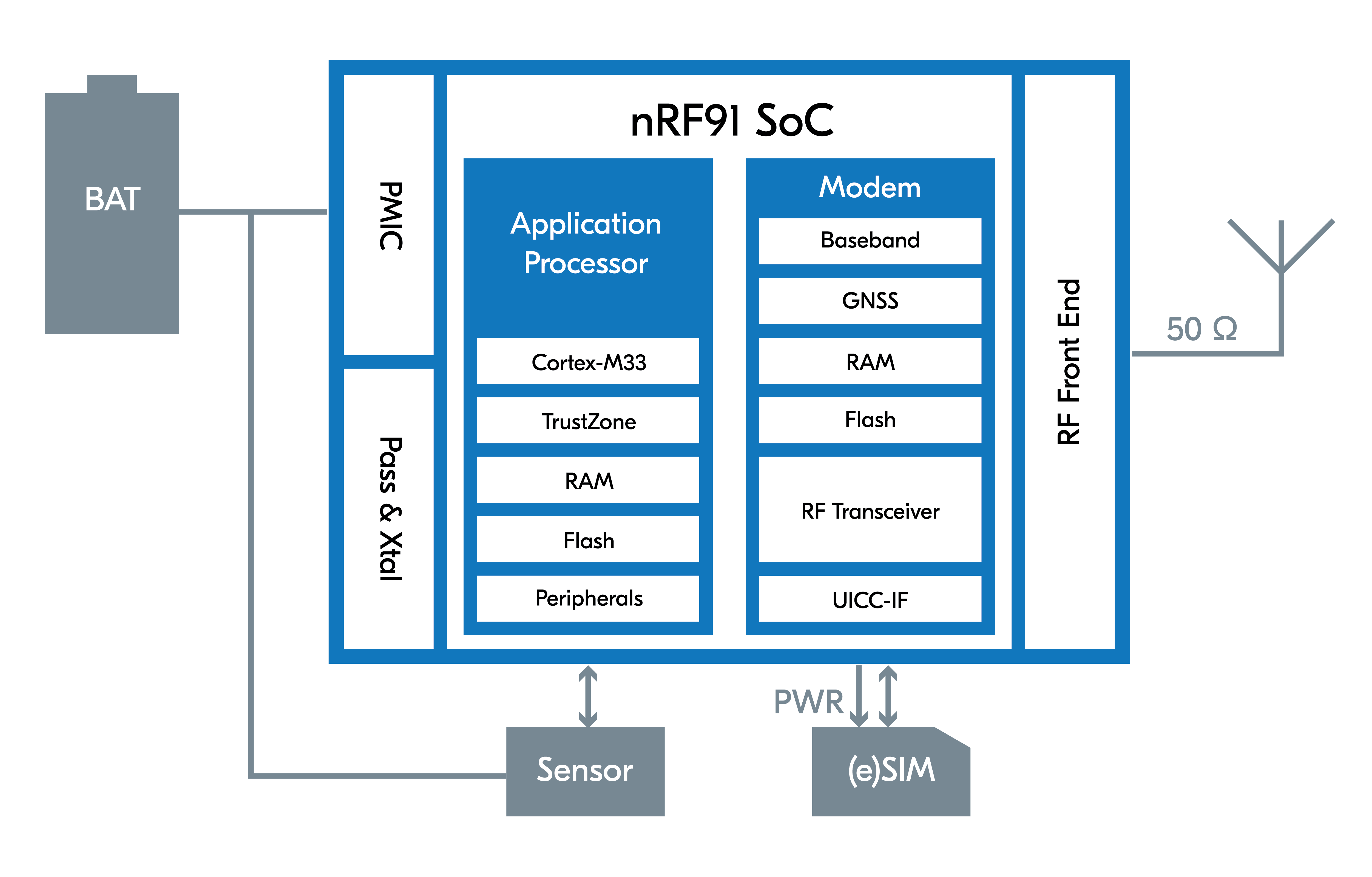 The nRF9160 is a compact, all-in-one System-in-Package (SiP) that gives you everything needed for advanced cellular IoT products. It features a dedicated Arm Cortex-M33 processor with 1MB of Flash and 256kB of RAM, ready to run your application and enable powerful edge computing.